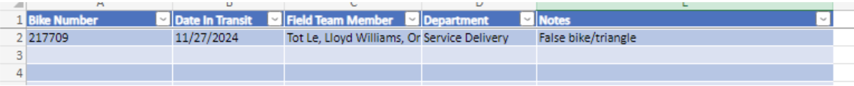 This guide is a step-by-step walkthrough on how to conduct the Daily in Transit Audits. For further information, please look at the full SOP available on Ops Source. For a guide on debugging and how to determine if a bike is recoverable, please see the Debugging Bike and Battery Training - April 2023.pdf.